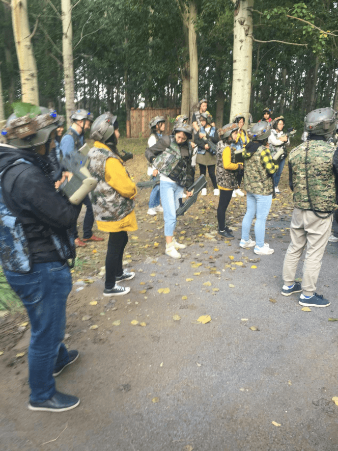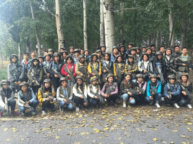 酒足饭饱后,开始正式步入真人CS活动,同样是按人数依次分为两组:猛虎队与武松队,穿好服装、拿好装备,等待教练讲好游戏规则后,两组战士们在小树林中开战。
