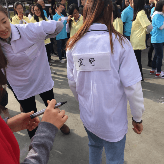 公司全体员工在教练的安排下穿好队服、贴好名牌,按人数依次分为四组:红、白、黄、蓝,并选出公司最帅的四位男士担当队长。