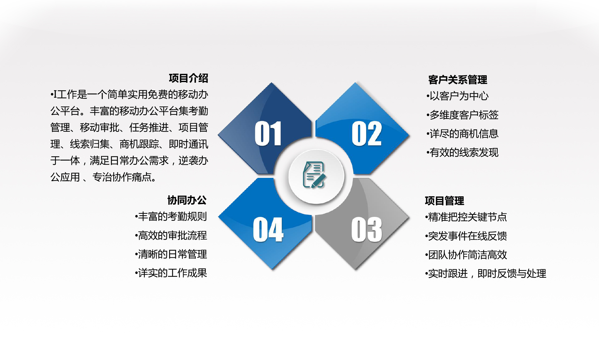 i工作是一个简单实用免费的移动办公平台。丰富的移动办公平台集考勤管理、移动审批、任务推进、项目管理、线索归集、商机跟踪、即时通讯于一体,满足日常办公需求,逆袭办公应用 、专治协作痛点。