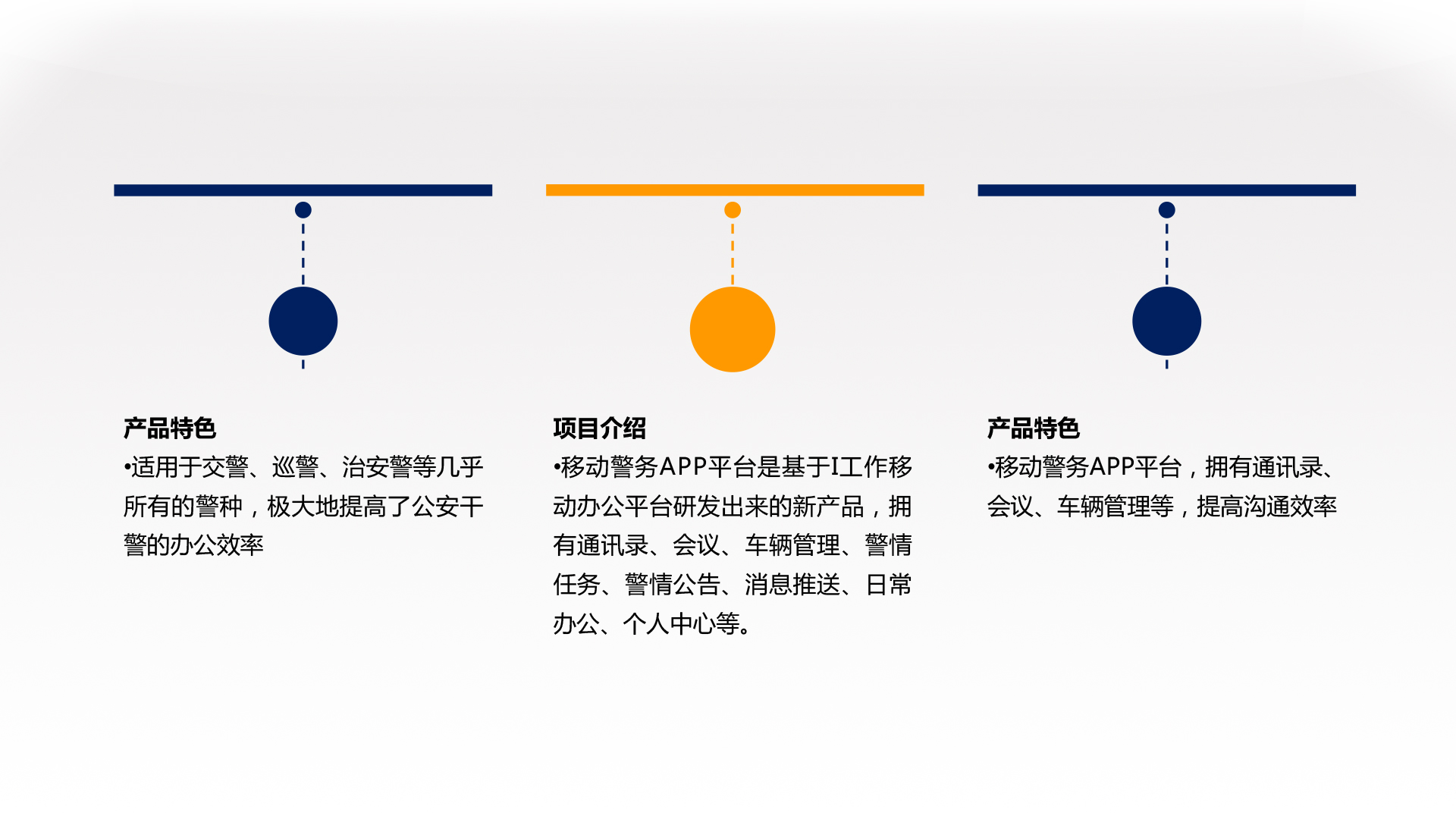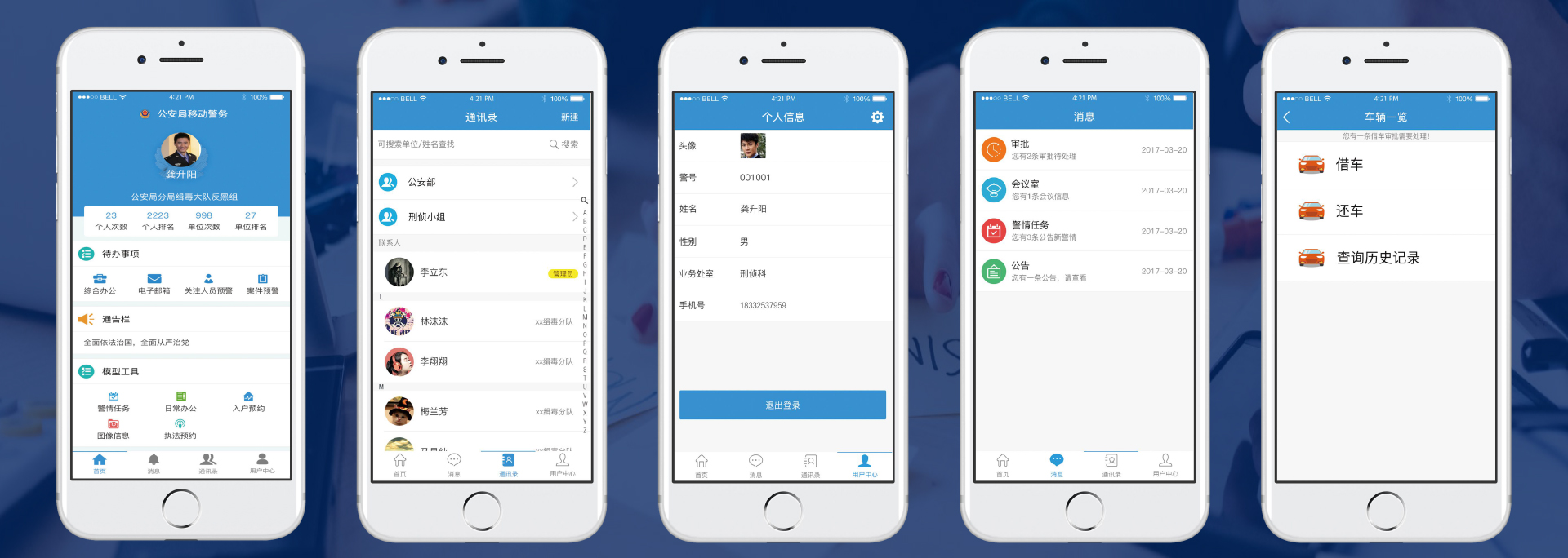 移动警务APP平台是基于I工作移动办公平台研发出来的新产品,拥有通讯录、会议、车辆管理、警情任务、警情公告、消息推送、日常办公、个人中心等。
